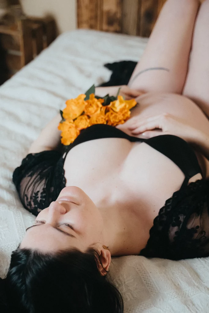 Pour l’intérieur, prenez le temps d’essayer est de choisir des sous vêtements que vous aimez. Une jolie lingerie blanche ou noire par exemple ! Accessoiriser votre lingerie avec un gilet oversize pour donner un petit coté cocooning ou pourquoi pas aussi une chemise blanche. Si vous n’avez pas tout ça, pas d’inquiétude, je vous envoie une liste de vêtement que vous avez dans vos armoires et sinon j’ai des petites choses pour vous au studio.